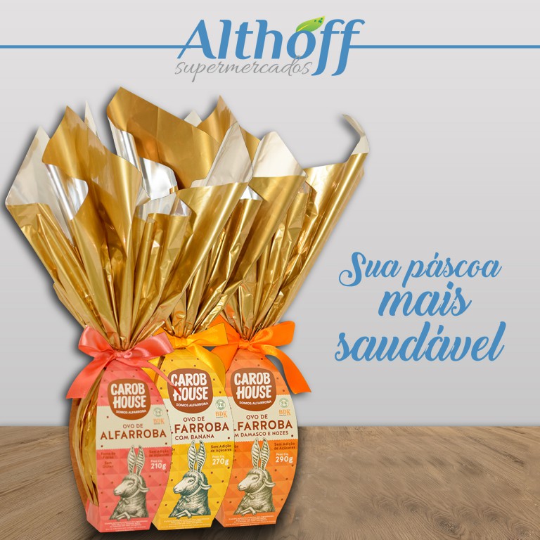 Nessa Páscoa encontre ovos de alfarroba no Althoff Supermercados. Consulte a loja de sua preferência sobre a disponibilidade deste produto.