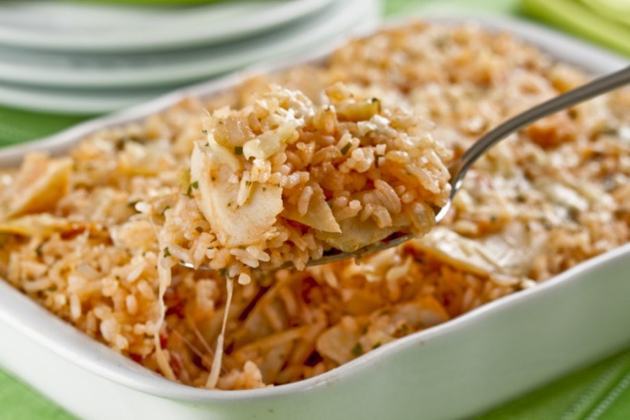Junte os tomates secos, a salsinha, as passas e misture. Reserve. Preaqueça o forno em temperatura média (180°C). Coloque o arroz em um refratário médio e cubra com a broa ralada.