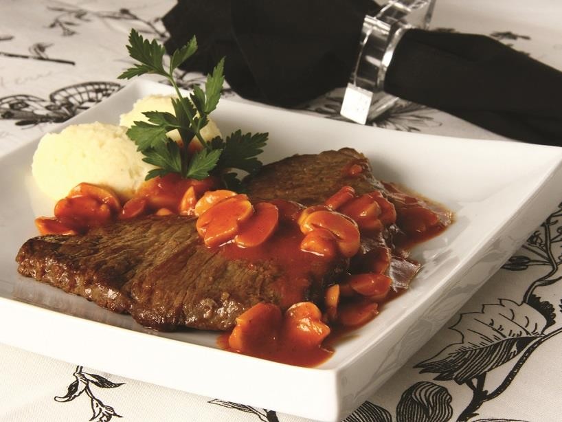 Por último, agregue o suco de tomate e o vinho. Ajuste o sal e deixe levantar fervura. Espalhe sobre os bifes e sirva com purê de batata.