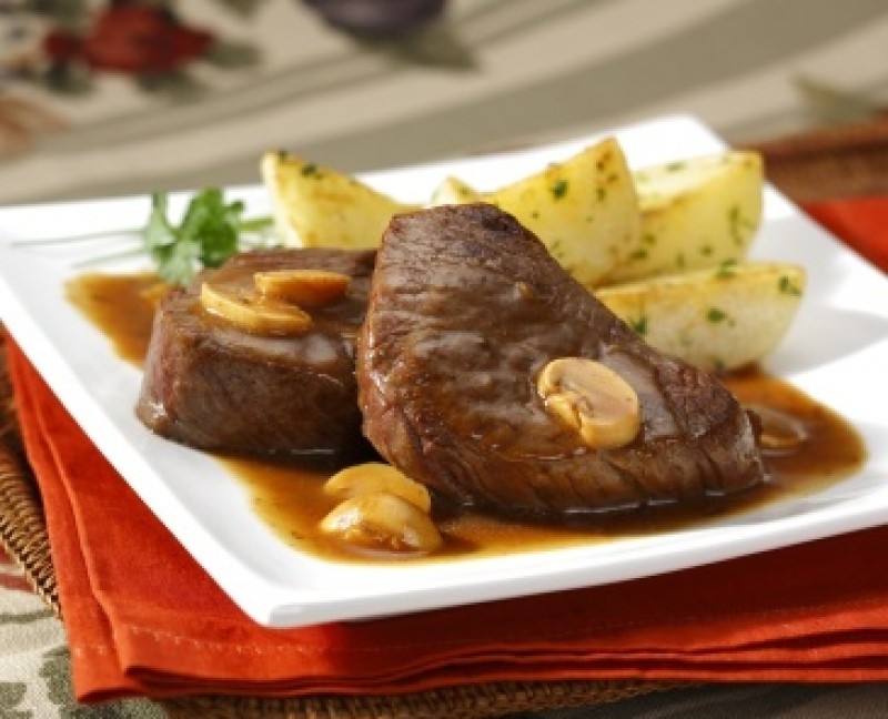 Tempere os medalhões com sal e pimenta-do-reino. Em uma frigideira, sele a carne no ghee e reserve. Em outra frigideira, salteie os cogumelos no ghee e tempere com sal e um pouco de alecrim. Reserve. Adicione o restante do alecrim, a cebola e o alho na frigideira em que o medalhão foi preparado, doure e adicione o vinho. Deixe cozinhar em fogo baixo até reduzir pela metade. Retire do fogo e coe. Leve o molho ao fogo novamente e adicione uma colher (chá) de ghee. Disponha as fatias de cogumelo em cima do medalhão intercalando uma por uma, formando escamas. Leve ao forno a 160 °C por aproximadamente 10 minutos. Retire do forno, disponha o molho em um prato ou travessa e acomode os medalhões por cima do molho.