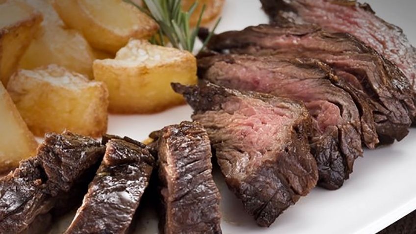 Dispor a fraldinha sobre a cama de batatas, cobrir com papel alumínio e levar ao forno preaquecido a